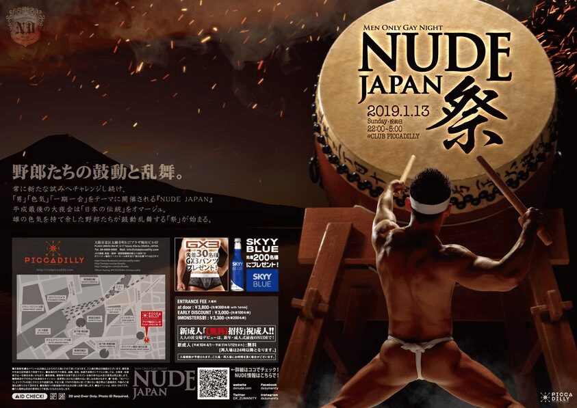 もうひとつが「NUDE」ですね。こちらは1月の三連休、成人式の前日に行われました。ピカデリー梅田で行われ、「ZUMANITY」よりも規模が劣りますが多くのゲイが集結しました。