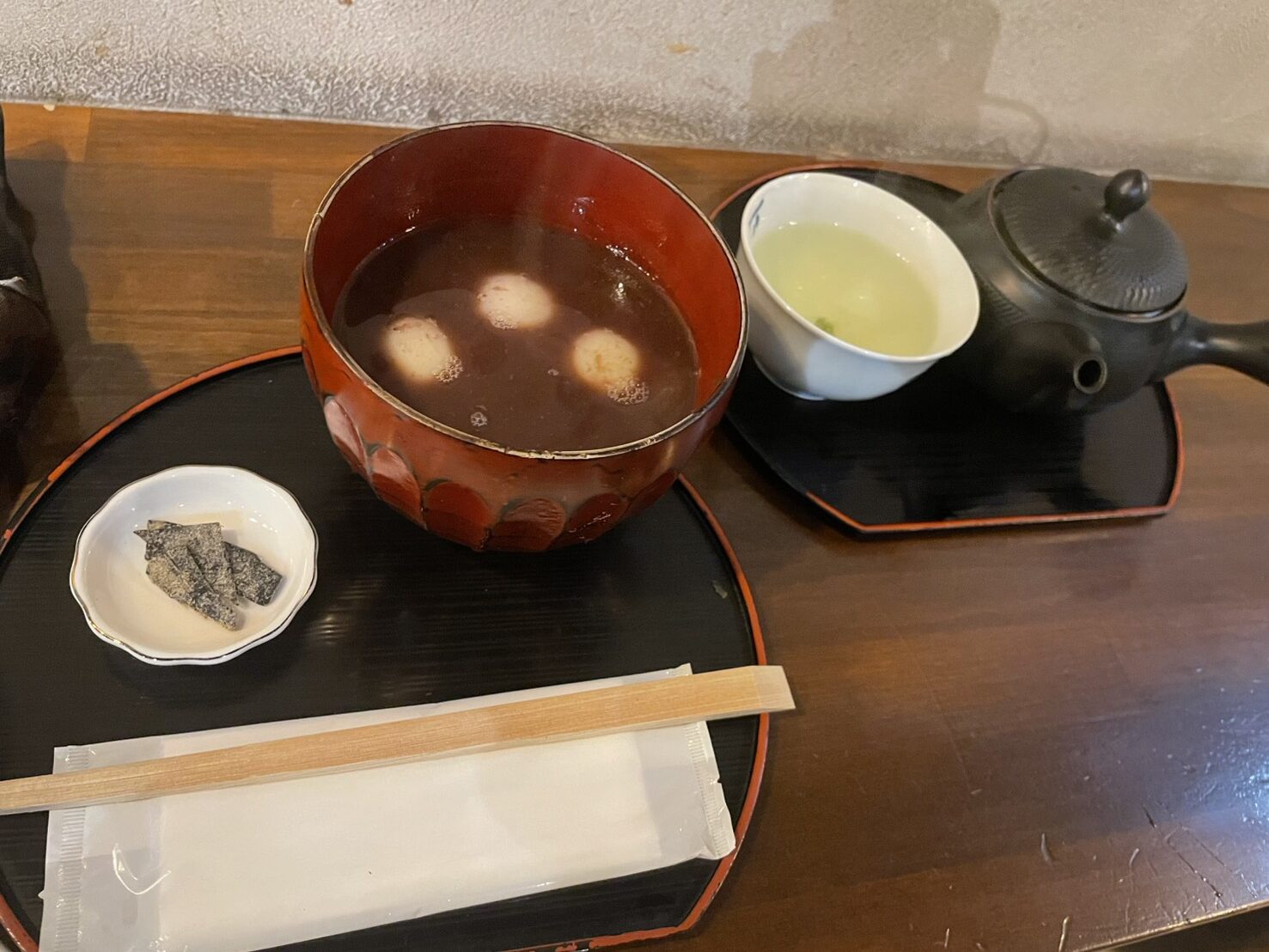 甘いぜんざいと急須から入れるほろ苦いお茶をいただきました。疲れた体に染みわたりました。