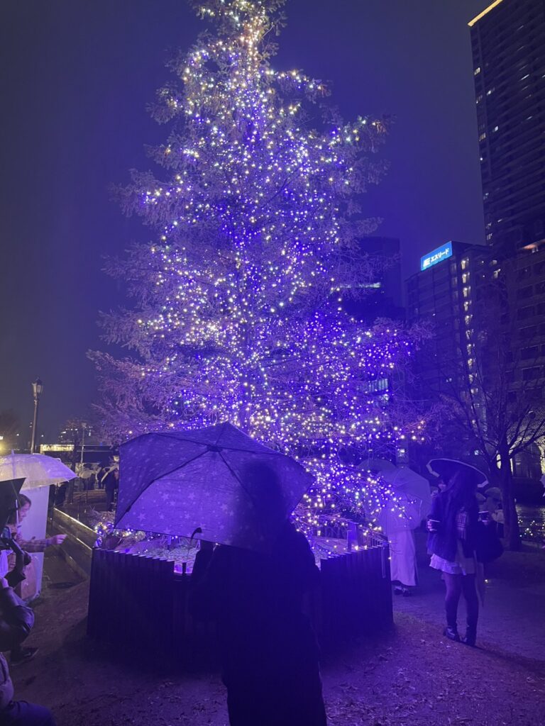 あいにくの雨でしたが、クリスマスマーケットならではの美味しいフードを堪能しました。クリスマスツリーとイルミネーションがきれいでした。